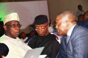 Pix 1 (L-R) Former president of Nigeria Chief Olusegun Obasanjo, vice president of Nigeria, professor Yemi Osinbajo , president \ CE Dangote Industries Limited and Co- Chairman AfroChampions Aliko Dangote, at the launching of AfroChampions Initiative in Lagos on 14-10-2017.