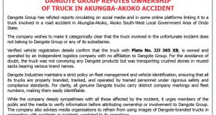 Dangote Group has refuted reports circulating on social media and in some online platforms linking it to a truck involved in a road accident in Akungba-Akoko, Akoko South-West Local Government Area of Ondo State. The company wishes to make it categorically clear that the truck involved in the unfortunate …