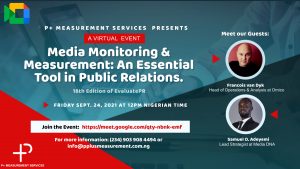 Nigeria’s foremost media intelligence agency, P+ Measurement Services is set to host its quarterly edition of EvaluatePR as it welcomes all communications professionals around the globe to the 18th edition of this event.