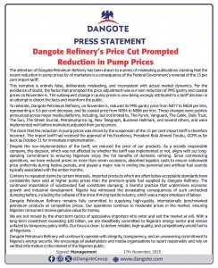 This narrative is entirely false, deliberately misleading, and inconsistent with actual market dynamics. For the avoidance of doubt, the factor that prompted the price adjustment was our own reduction of PMS gantry and coastal prices on November 6. The subsequent change in pump prices is now being wrongly attributed to a tariff decision in an attempt to distort the facts and misinform the public.