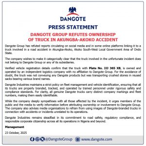 While the company deeply sympathises with all those affected by the incident, it urges members of the public and the media to verify information before attributing ownership or involvement to Dangote Group. The company also advises media organisations to refrain from using images of Dangote-branded trucks in connection with accidents or incidents unrelated to its operations.