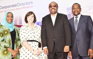 L-R: Group Executive Director, Dangote Industries Limited, Halima Aliko Dangote; Wife of former British Prime Minister, Cherie Blair (Guest Speaker); Former Prime Minister of Ethiopia, Hailemariam Desalegn (Guest Speaker); and President/CE, Dangote Industries Limited, Aliko Dangote, at the 2019 Women Corporate Directors Lecture sponsor by Aliko Dangote Foundation, theme “The courage to Lead; Inspiring Others, Overcoming Challenges and Achieving Success, in Lagos on Thursday, April 25, 2019