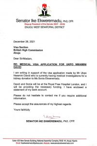 “I am writing in support of the visa application made by Mr Ukpo Nwamini David who is currently having medical investigations for a kidney donation to Ms Sonia Ekweremadu.