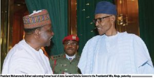 President Muhammadu Buhari yesterday met with former head of state, General Yakubu Gowon at the Presidential Villa.