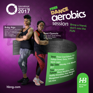 The Dance Aerobics session, which will be anchored by Ruby Agu, who is a certified Fitness Trainer, Weight Management Specialist and Wellness Blogger, and Tomi Oyesola, Heritage Bank’s Group Head of Retail Banking for Lagos Island Region – who is a fitness enthusiast herself – is aimed at fostering a sense of well-being among women staff and customers of Heritage Bank as part of the activities to mark the Imternational Women’s Day.