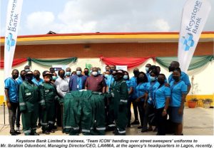 Keystone Bank Limited’s new intakes who recently graduated from the bank’s training school – The Keystone Bank Learning Academy Lagos, have donated 60 units of street sweepers’ uniforms to the Lagos State Waste Management Authority (LAWMA).