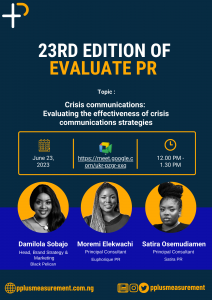 P+ Measurement Services, a leading Media Intelligence Consultancy, is thrilled to announce the upcoming 23rd edition of #EvaluatePR. This highly anticipated event, held quarterly, will be conducted virtually on June 23rd, 2023, from 12:00 to 1:30 pm (West African Time), providing an inclusive platform for PR professionals to engage in enriching discussions, gain valuable insights, and stay abreast of the latest industry trends.