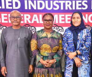 L-R: Chairman, NASCON Allied Industries Plc, Olakunle Alake; Managing Director, NASCON Allied Industries Plc, Aderemi Saka; Non-Executive Director, NASCON Allied Industries Plc, Fatima Aliko Dangote, at the NASCON Allied Industries Plc 2025 Annual General Meeting held in Lagos on Monday, April 27, 2026