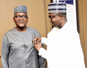 L-R : President/CE, Dangote Industries Limited, Aliko Dangote, being decorated by Chairman/Chief Executive, National Drug Law Enforcement Agency (NDLEA), Brig. Gen. Buba Marwa (Rtd), as the Grand Ambassador of War Against Drug Abuse (WADA) of the Agency, on Thursday, June 2, 2022 during a courtesy visit to Dangote Head Office in Lagos.