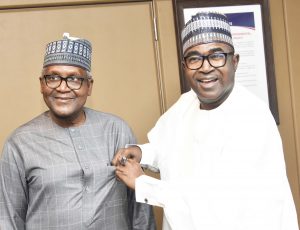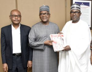 President/Chief Executive, Dangote Industries Limited, Aliko Dangote, receiving NDLEA Newsletter from Chairman/Chief Executive, National Drug Law Enforcement Agency (NDLEA), Brig. Gen. Buba Marwa (Rtd), where he was honoured as the Grand Ambassador of War Against Drug Abuse (WADA) of the Agency, with Group Managing Director, Dangote Industries Limited, Olakunle Alake (left) on Thursday, June 2, 2022 during a courtesy visit to Dangote Head Office in Lagos.