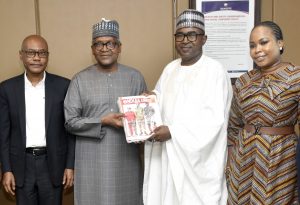 President/Chief Executive, Dangote Industries Limited, Aliko Dangote, receiving NDLEA Newsletter from Chairman/Chief Executive, National Drug Law Enforcement Agency (NDLEA), Brig. Gen. Buba Marwa (Rtd), where he was honour as the Grand Ambassador of War Against Drug Abuse (WADA) of the Agency, with Group Managing Director, Dangote Industries Limited, Olakunle Alake (left) and Group Executive Director, Dangote Industries Limited, Dr. Adenike Fajemirokun (right), on Thursday, June 2, 2022 during a courtesy visit to Dangote Head Office in Lagos.