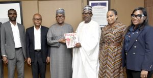 President/Chief Executive, Dangote Industries Limited, Aliko Dangote, receiving NDLEA Newsletter from Chairman/Chief Executive, National Drug Law Enforcement Agency (NDLEA), Brig. Gen. Buba Marwa (Rtd), where he was honour as the Grand Ambassador of War Against Drug Abuse (WADA) of the Agency, with Group Chief Corporate Strategy, Dangote Industries Limited, Aliyu Suleimon(left); Group Managing Director, Dangote Industries Limited, Olakunle Alake (2nd left) and Group Executive Director, Dangote Industries Limited, Dr. Adenike Fajemirokun (2nd right), and Group Chief Human Resources Officer, Dangote Industries Limited, Nglan Niat (right), on Thursday, June 2, 2022 during a courtesy visit to Dangote Head Office in Lagos.
