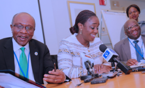 BRIEFING—From left: CBN Governor, Mr Godwin Emefiele; Head of Nigerian Delegation and Minister of Finance, Mrs Kemi Adeosun and the Permanent Secretary at the Ministry of Finance, Mr Mohammed Duste, during post-World Bank and IMF 2017 Annual meeting press briefing, held in Washington DC, USA, yesterday. PHOTO. State House Photo.