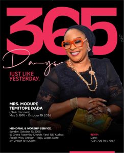 A one-year memorial service in her honour will be held on Sunday, October 19, 2025, at Grace Assembly Church, Yard 158, Kudirat Abiola Way, Oregun-Ikeja, Lagos, from 12:00 noon to 1:00 p.m.