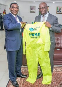 L-R: Mr. Obeahon Ohiwerei, MD/CEO, Keystone Bank Limited, His Excellency, the Executive Governor of Edo State, Mr. Godwin Obaseki during the presentation of sweepers’ jacket by the bank to the Edo State government at the governor’s office in Benin City, Edo State recently.