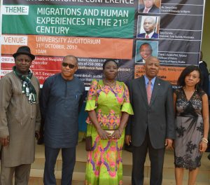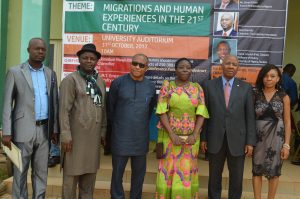 L-R: Member, Department of Languages, Linguistics and Literary Studies, Federal University Ndufu-Alike, Ikwo Ebonyi State (FUNAI); Akachi Adimora-Ezeigbo; Guest Speaker and Professor, Marquette University, USA, Prof Chima J. Korieh; Dean, Faculty of Humanities, FUNAI, Prof GMT Emezue; CEO, Heirs Holdings, Emmanuel Nnorom representing the Guest Speaker and Founder, Tony Elumelu Foundation, Tony O. Elumelu; and Director, School of Foundation Studies, FUNAI, Prof Michael Onuu at FUNAI’s 2017 Faculty of Humanities International Conference held at the University’s Auditorium in Ndufu-Alike, Ikwo Ebonyi State on Tuesday.