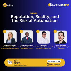 Since its launch, EvaluatePR has become a global thought-leadership platform where communications, PR, and media experts debate the future of measurement and evaluation. The September edition will bring together seasoned voices, including Steph Bridgeman, Media Intelligence Director at Experienced Media Analysts; Lukmon Oloyede, Managing Consultant at BrandArena Communications; Mayur Raja, Senior Manager, Operations at Onclusive India; and Petyo Bogdanov, Project Manager, Media Analytics at Commetric. These experts will unpack the realities of an industry at the crossroads of human judgment and machine intelligence.