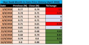 In response to profit taking in the Nigerian equities market between February and April 2018, a situation which has seen many stocks give up the entire growth so far made in 2018, the stock price of Skye Bank though showing some levels of resilience but not being entirely immune to negative market trend progressively declined 62kobo as at the 11th day April, 2018. In a dramatic move, the stock staged a comeback to gain about 42% price reversal to 88kobo on Monday 16th of April, 2018. Within this period, the stock price also remained one of the best in the market.