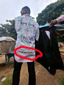 Jack, in an ecstacy of rounding off his studies successfully in the university, inscribed a bold message of gratitude, “Thank You NELFUND”, at the back of his white shirt, which also had signatures of other students, who took turns to congratulate the student on the completion of his studies.