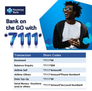 The *7111# USSD (Unstructured Supplementary Service Data) banking solution enables Keystone Bank customers to conveniently perform third party transfers to both Keystone Bank and other bank account holders in Nigeria, open Keystone Bank accounts, buy airtime, pay bills and access a mini statement such as balance enquiry using their mobile phones without necessarily having internet data or airtime.