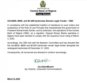 The statement reads: “In compliance with the established tradition of obedience to court orders and sustenance of the Rule of Law Principle that characterized the government of President Muhammadu Buhari, and by extension, the operations of the Central Bank of Nigeria (CBN), as a regulator, Deposit Money Banks operating in Nigeria have been directed to comply with the Supreme Court ruling of March 3, 2023,” the statement reads.