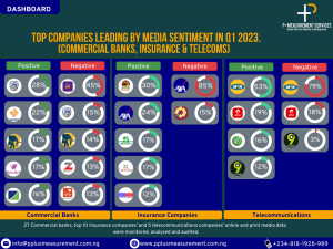 In the first quarter of 2023, P+ Measurement Services, Nigeria’s leading media intelligence consultancy, examined the media mood around commercial banks, big insurance providers, and telecommunications in Nigeria. This analysis shows editors’, publishers, journalists, and opinion leaders’ perceptions of insurance, commercial banking and telecommunication brands in the print and online media.