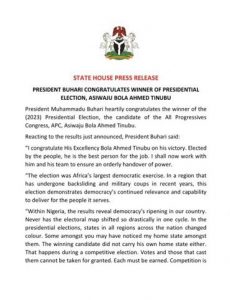 President Muhammadu Buhari has congratulated the winner of 2023 presidential election, the candidate of the All Progressives Congress, APC, Asiwaju Bola Ahmed Tinubu.