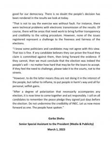 “I know some politicians and candidates may not agree with this view. That too is fine. If any candidate believes they can prove the fraud they claim is committed against them, then bring forward the evidence. If they cannot, then we must conclude that the election was indeed the people’s will – no matter how hard that may be for the losers to accept. If they feel the need to challenge, please take it to the courts, not to the streets.