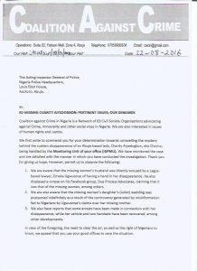“We first write to commend you for your determination towards unravelling the mystery behind the sudden disappearance of an Abuja-based lady, Charity Aiyedogbon, aka Chacha, being handled by the Monitoring Unit of your office (IGPMU).”