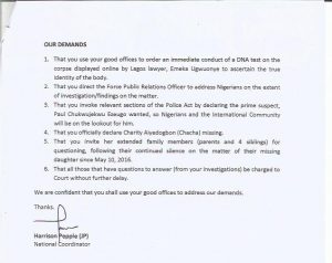Other demands by the group are that the Police “officially declare Charity Aiyedogbon (Chacha) missing; invite her extended family members (parents and 4 siblings) for questioning, following their continued silence on the matter of their missing daughter since May 10, 2016 and all those that have questions to answer (from your investigations) be charged to Court without further delay.”