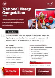 All essays must be handwritten (not typed) and students have up until October 14th, 2022 to upload the scanned copies of their handwritten entries as well as their IDs on the digital portal at www.ubagroup.com/national-essay-competition. No physical copies will be accepted this year.
